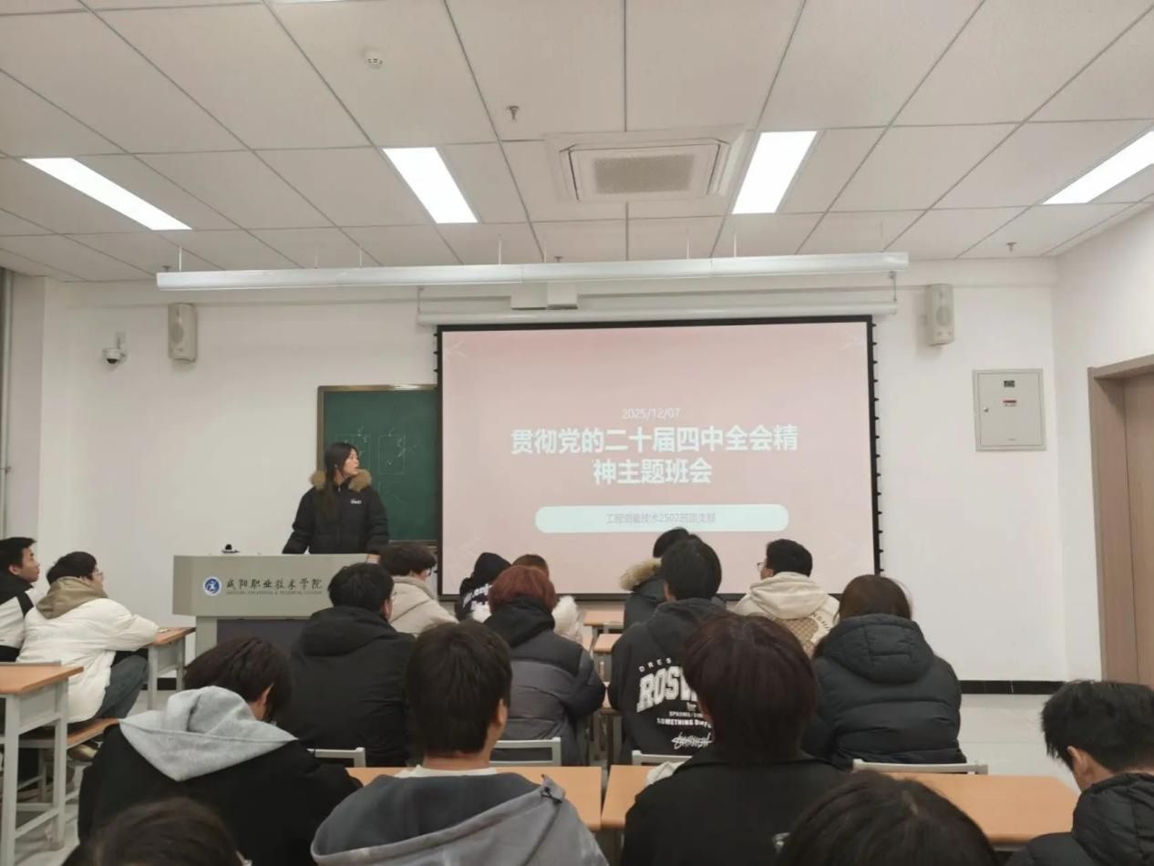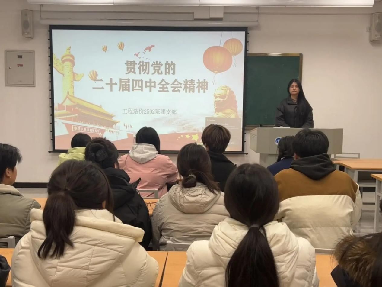 为引导青年学子深刻领会党的二十届四中全会精神,推动理论学习与专业成长深度融合,将个人理想追求主动融入国家建设大局,12月8日,建筑工程学院组织开展“深学细悟全会精神、挺膺担当强国工程”主题学习班会,让全会精神在青年学子心中扎根、在专业实践中落地。